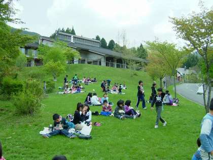 入所式の後,宿泊等で宿泊準備をした後,水車小屋の横の芝生でおべんとうを食べました。からっとしたとっても気持ちのよい環境です。