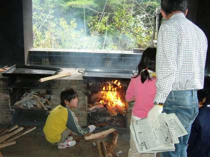 材料ができたら,かまどに火をお起こしていためて,そばを入れて焼いていきます。
