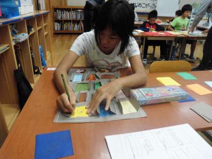 図工の学習で「まどをひらいて」という学習を行っています。子どもたちが想像した建物や乗り物等に窓を作り,その窓から誰が出てくるのかを考えながら作っています。「にんじゃやしき」や「自分が想像した学校」「自分の好きな乗り物」等々色画用紙に描いたものをはさみで切り,窓からどのような人や動物,物等が出てくるのか考えながら描いています。出来上がりが楽しみです!