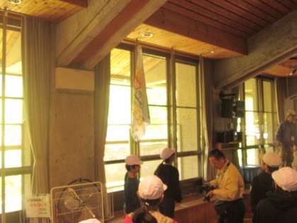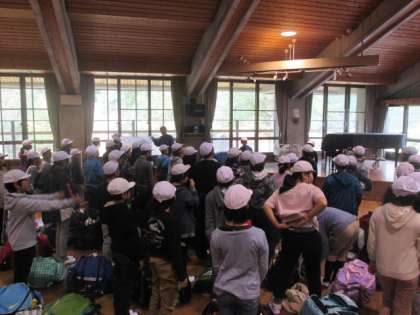本館に入ったところの、オリエンテーションホールで、入所式をしました。出発するときはいい天気だったのですが、さすがに山間部はぱらぱらと小雨が降っています。山の家の職員の方に元気にあいさつをして、4日間の長期宿泊学習のはじまりです。