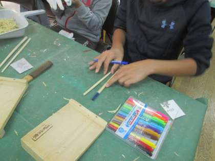 最後は、油性ペンで自分の名前や模様をかいて完成です。世界にひとつの「マイ箸」です。山の家の思い出として、大切に使ってほしいです。