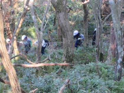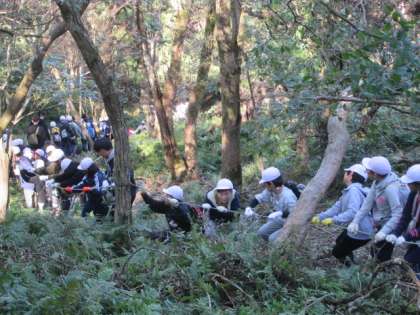 下り道は、途中で急な坂道になっていて、ロープにつかまりながら降りていきます。滑りやすい道で、スリル満点です。みんな無事に降り切ることができました。