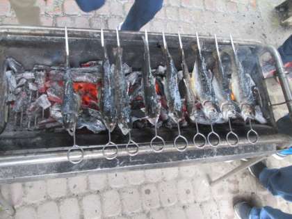 つかまえた魚は、はさみを使って自分でさばいて、串にさします。それを炭火で焼いていただきます。焼きあがるころには、あたり一面にとてもいい匂いがしていました。とてもおいしくいただきました。「自然の恵みに感謝」です。