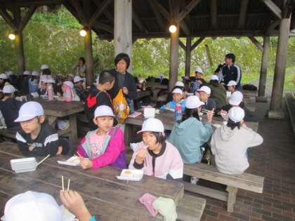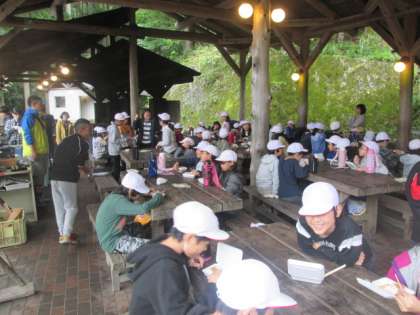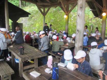 魚つかみを終えて、野外炊事場で最後の昼食のお弁当(おにぎり)をいただいています。3泊4日の長期宿泊学習もいよいよフィナーレです。このあと、研修室で振り返りをして、14時に退所式の予定です。