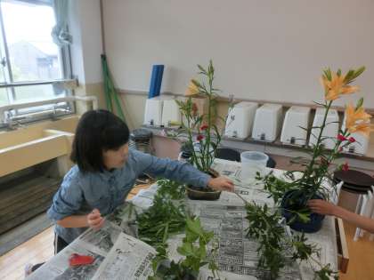 生ける花の葉を適度に取り除きながら,だんだんと形を整えていきます。