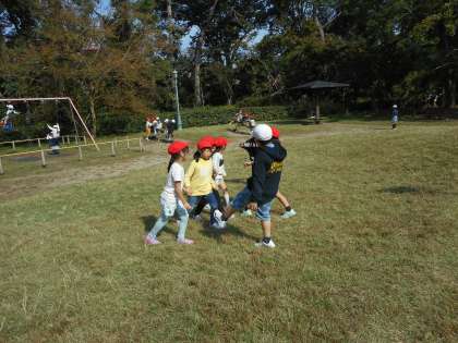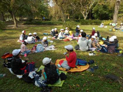 芝生の広場にビニルシートを広げ,お弁当をいただきました。お家の人が作ってくれたお弁当,みんなおいしそうに食べていました。