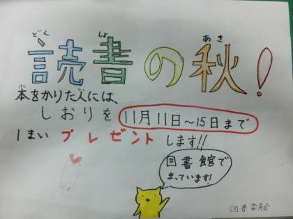 今日の朝学習の時間に,図書委員会の子どもたちが各教室を回り,「しおりキャンペーン」のお知らせをしました。
