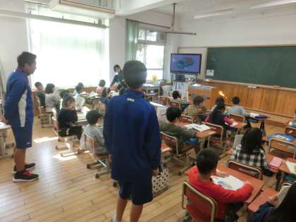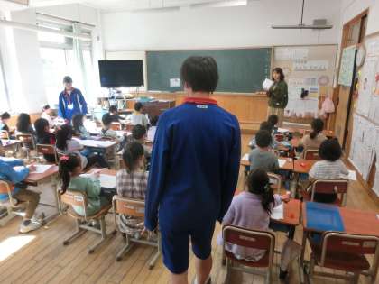 低学年は大きなお兄ちゃん,お姉ちゃんが来てくれてうれしいようで,休み時間も一緒に遊んでいます。実習生もがんばってくれています。