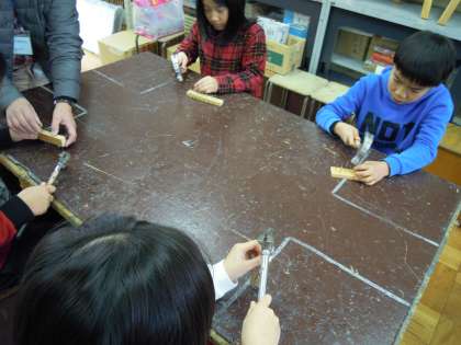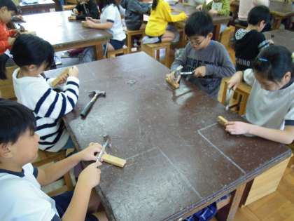 今日,図工科の学習で金づちを使ってくぎを打ちました。金づちは,3年生にとっては慣れない道具のようで,最初は恐る恐る使っていましたが,最後には楽しそうにくぎを打っていました。今後,くぎうちをしながら楽しい作品作りに挑戦します。