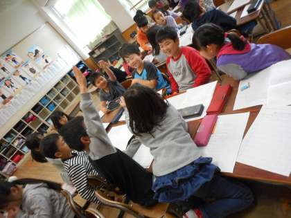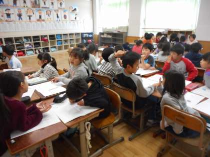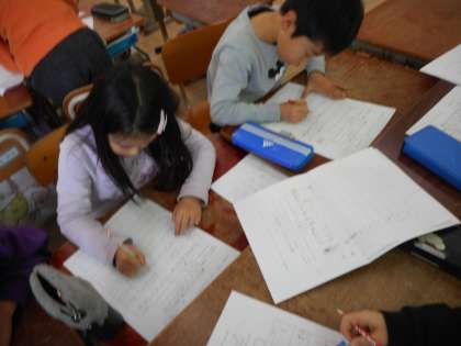 生活科「大すき いっぱい わたしたちのまち」の学習で,まち探検に出かける準備をしています。グループに分かれて,どんなことを聞いてくるか話し合いました。