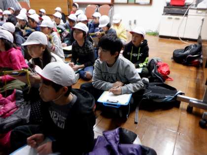22日に,4年生の森林教室を行いました。にじの子学級の4年生3人も,ワクワクしながら参加しました。昨年,自分たちで取り付けた巣箱の様子や衣笠山に生息する生き物の種類など,スライドを交えたお話を聞き,普段何気なく見ている衣笠山にもたくさんの生き物がいることを改めて確認していました。お話の後は,みんなで衣笠山に登り巣箱を外しに行きました。途中,木の実やキノコ,りすが食べた松ぼっくりなどを見つけました。