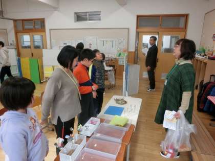 2月7日(金)に,北下支部の育成学級の先生方をお客様とし,お店を開いて今まで学習してきた仕事について発表をしたり仕事で作ってきた作品をお渡ししたりする学習を行いました。前日まで,どのお客様が来るのか内緒にしていましたので,子どもたちはドキドキしながら学習を進めてきました。北下支部だけではなく,他支部の先生方にも授業をみてきただきました。たくさんの方々にみていただいたので,子どもたちはとても嬉しそうでした。写真は,子どもたちがお店を開いて,作品をお客様へお渡ししている様子や,どんな仕事を行ってきたのかお話をしている様子です。