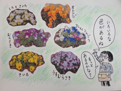 みなさんも,お家のまわりやおさんぽのとちゅうでいろいろな花を見つけて,色や形(かたち)のうつくしさやおもしろさを感(かん)じてみましょう!