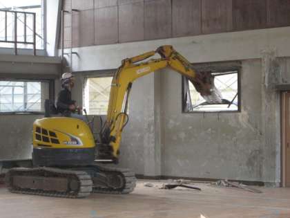 講堂の工事の様子〜講堂の中に重機が・・・〜