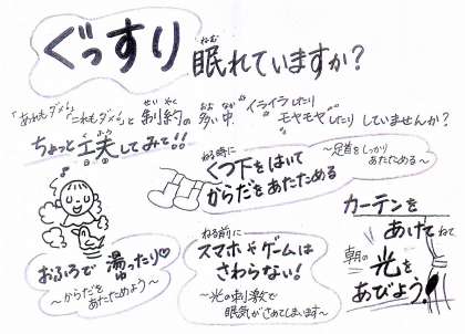 養護教諭の中村先生が,みなさんにメッセージを書いてくださいました。今回は,ぐっすり寝るための工夫です。学校が再開した時に毎日元気に登校できるように,家での健康管理をしっかりしておきましょうね。