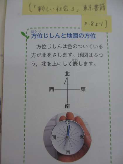 地図の上を北,右がわを東,左がわを西,下がわを南といいます。方位をしらべるには,方位じしんを使います。【「わたしたちの京都(上)」P,2より】