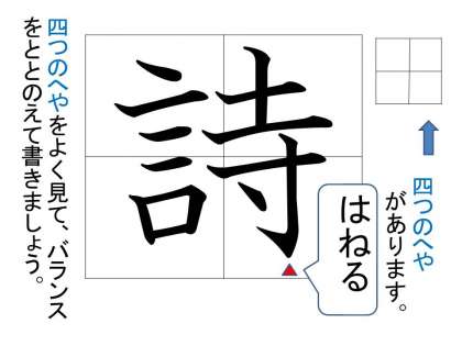 「漢字の力 スキル」で漢字を練習するときは「4つのへや」に気をつけて書きましょう。漢字を練習する1マスは4つにわかれていて,「4つのへや」があります。それぞれのへやにどの部分(ぶぶん)があるかをよく見て書くと,バランスよく,ちょうどいい大きさで書くことができます。