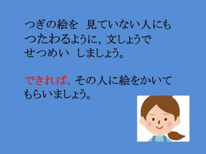 通級指導担当の片山先生からの問題です。今回は,言葉で伝えるトレーニングです。答えの例は明日ホームページで紹介しますので,とんなふうに伝えればうまく伝わるか,考えてみてくださいね。