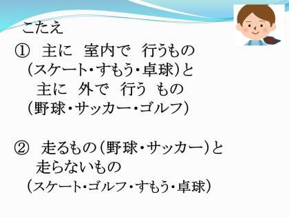 昨日の問題,考えられましたか?ほかにもいろんな仲間わけの仕方があるかもしれませんね。