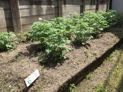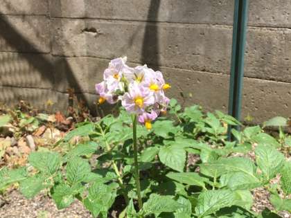 北校舎図工室北側にある,6年生の学年園では,理科の学習で使うジャガイモを育てています。すくすくと生長しています!ジャガイモの花も咲いてきています。