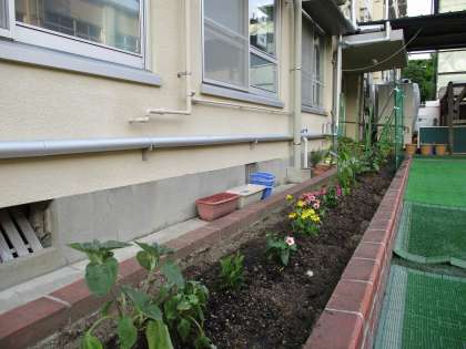 花壇に,花と野菜の苗を植えました。葉っぱの形や花のつぼみから,何の苗かを予想しました。どんな花が咲くのかな。どんな野菜ができるかな。みんな楽しみにしています。
