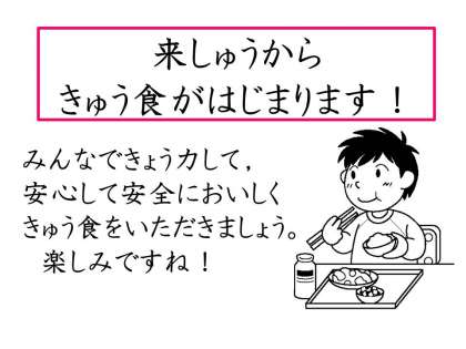 子どもたちはきゅう食をとても楽しみにしているようで,じゅぎょうのはじめにすきなきゅう食のメニューをたずねると「カレー!」「プリプリ中かいため!」「チリコンカーン!」「マーボーどうふ!」などたくさん教えてくれました。その後,本年度のきゅう食のじゅんびの仕方や食べ方,かたづけ方についてのお話をしっかりと聞くことができました。