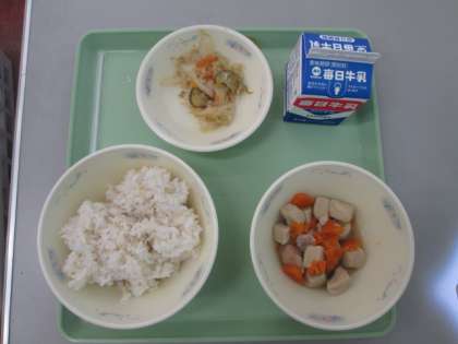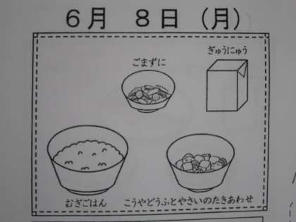 今日の献立は,麦ごはん,牛乳,高野豆腐と野菜の炊きあわせ,ごま酢煮でした。A班の人とB班の人とで,メニューが変わってしまいますが,金曜日からはみんなで一緒に食べることができるので,それまでに給食時間の決まりを少しずつ覚えていきましょうね。