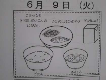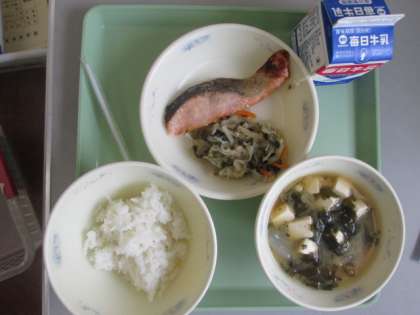 今日の献立は,ごはん,牛乳,鮭の塩こうじ焼き,小松菜と切干し大根の煮びたし,みそ汁,でした。静かに「いただきます」をしたあとは,おしゃべりせずにもぐもぐいただきました。金曜日からはみんなで一緒に食べます。おしゃべりしなくても,みんなで食べればきっともっとおいしいですよ!
