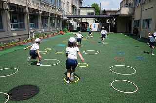 フラフープを使って,体を動かしました。音楽に合わせてジャンプしたり,手を叩いたりして楽しく体を動かすことができました。