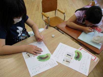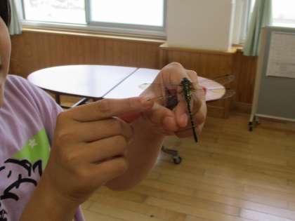 廊下にやってきたトンボも,教室に入れてあげて観察しました。指につかまっておとなしくなったり,羽をふるわせたり,天井に飛んでいったり・・・順番に手にのせたり網にのせて見たり,楽しく学習しました。