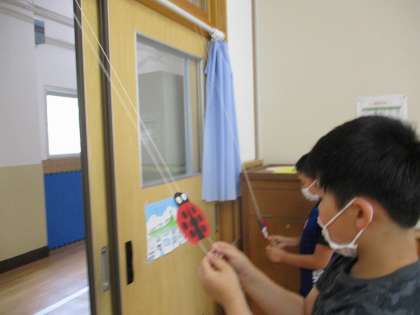 図工でテントウムシの飾りを作りました。「にじのこガーデンで見たよ。」「家の近くで見つけたよ。」と,テントウムシを見つけた時の様子を思い出して,羽の広げ方や触角の位置などを考えながら作りました。出来上がったテントウムシで遊んだ後は,北校舎の一階の廊下に飾りました。お花もちょうちょも喜んでいます。