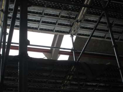 講堂の中の足場が組みあがったので,いよいよ屋根を外す工事を始められました。足場の板があるため,空が丸見え,とまではいきませんが,それでも講堂の中から空が見えるのは,なかなか珍しい景色です。