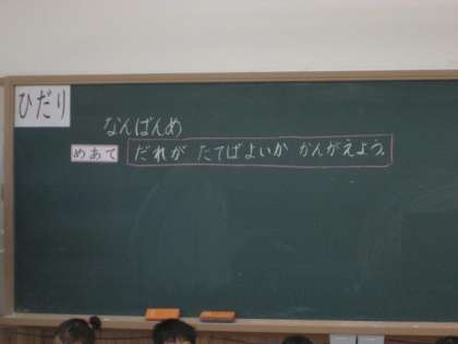 1年生の子どもたちが,教室の前に並んで座っています。右から何番目,左から何番目,を数える学習です。順番や位置を数で表すことができるようになるために,教科書だけでなく,自分たちで実際に並んで確かめています。