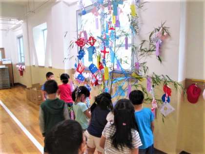 今日は7月7日。七夕です。あいにくの雨ですが,にじの子学級・1年生・2年生では,地域の方からいただいた笹を使って,七夕飾りを作って教室の前や階段の横の廊下に飾っています。