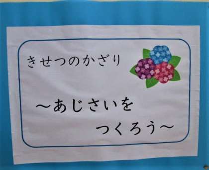 にじの子学級の子どもたちが作った,季節の飾りです。「お花紙」を丸めて貼っています。きれいなあじさいができました。