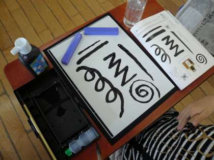 筆を下ろして,横線,縦線,うずまきなどの線の練習をしました。