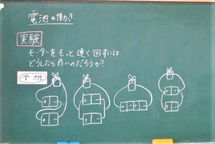 今日は,電池のつなぎ方によって,モーターが回る速さがどう変わるかを考えています。子どもたちは実験が大好きです。