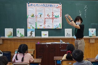 もうすぐ国語科で「スイミー」の学習を始めます。作者のレオ・レオニがかいた絵本を,学校図書館司書の前田先生が用意してくださいました。子どもたちは,いろんな絵本を紹介してもらい,とても嬉しそうでした。休み時間には,レオ・レオニの絵本を読んでいる子がたくさんいました。