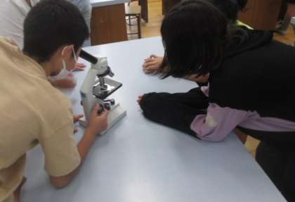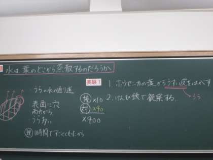顕微鏡を使って,植物の葉の裏側にある気孔の観察をしています。根から吸い上げられた水が,茎を通って葉から蒸散されていくことを確かめていきます。顕微鏡を上手に操作するのはちょっと難しいですが,くっきりと見えたグループからは,歓声があがっていました。