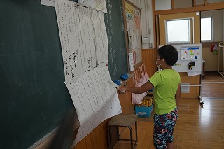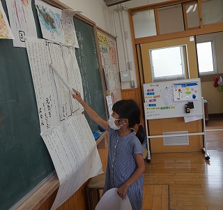 「スイミー」のお話を5つの場面に分けました。挿絵をヒントに,どこで場面が変わっているのかをみんなで話し合います。素晴らしい説明には,自然と拍手が起きました。「1人だったら分からなかったよ」という声もあり,みんなで学習することの良さに気付くことができました。