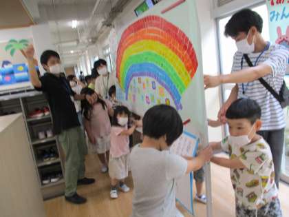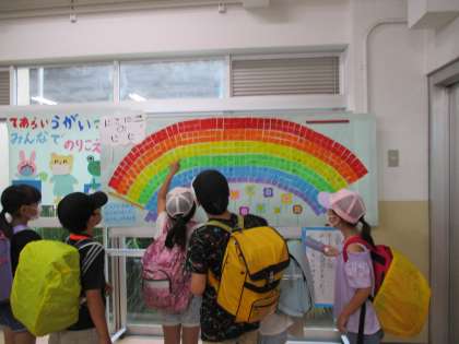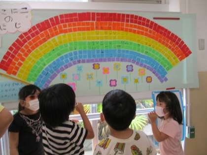 ついに!にこにこのにじが出来上がりました!みんなの笑顔がいっぱいの素敵なにじです。にじの子学級のみんなで,エントランスまで「よいしょよいしょ。」と運びました。なんだか,いつもよりもエントランスが明るくなったような気がしました。早速,立ち止まって見ている子どもたちもいましたよ。