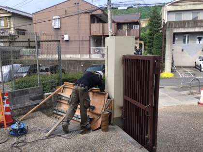西門の門柱横のフェンスと土台が劣化してきていたので,修繕していただいています。