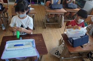 絵の具セットを初めて使うので,使い方や用具について学習しました。2時間目は,実際に絵の具を使って色を塗ります。濃さを調節して塗る練習をがんばります。