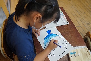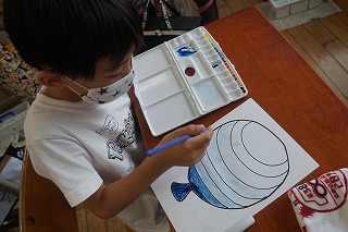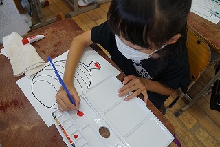 絵の具セットの使い方を学習し,初めて絵の具を使って色を塗りました。どんどん色を薄くしていくのをがんばりました。とても上手でした!