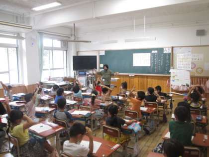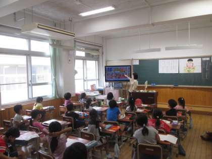 身の回りからカタカナで書く言葉を見つけ,これまでの学習を活かしてカタカナを使った簡単な文章を作る学習です。新聞広告等の資料からもカタカナを探し,どんな言葉がカタカナで書かれているか,一生懸命見つけていました。
