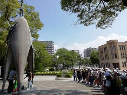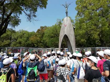 平和の子の像の前で,平和集会を行っています。