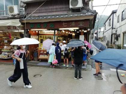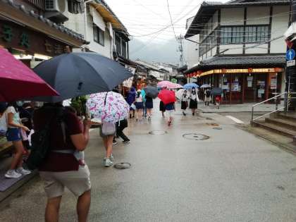 雨の中,宮島の商店街を回っています。
