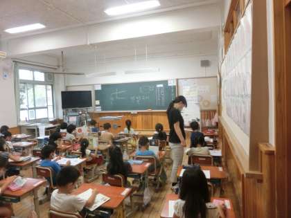 今日は3教室で,実習生が授業をしました。しっかりと準備した内容を1時間の中に盛り込み,生き生きと指導する姿が見られました。指導教官である担任が副担任としてフォローしながら,児童の指導に当たっています。