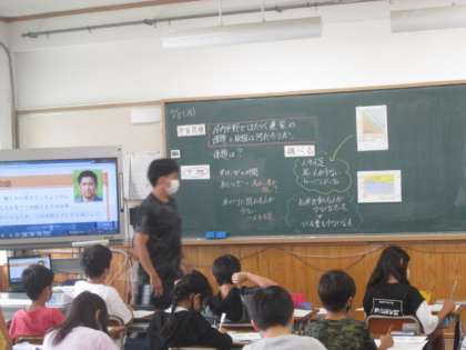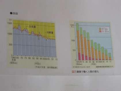 米の生産量や消費量,農業で働く人々の数の変化のグラフを見て,現在の農業の抱えている問題について考える学習です。なぜ生産量や消費量が減ってきているのか,なぜ農業で働く人の数が減ってきているのか,子どもたちは予想をもとに話し合っていました。