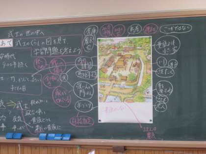奈良時代の貴族のくらしの学習から,平安時代の武士の世の中へと歴史学習も進んできました。武士の屋敷の絵を見て,武士のくらしは貴族のくらしとどのような違いがあったのかを考えていきます。